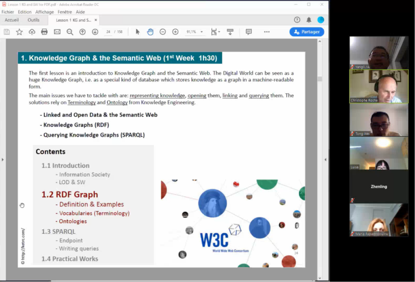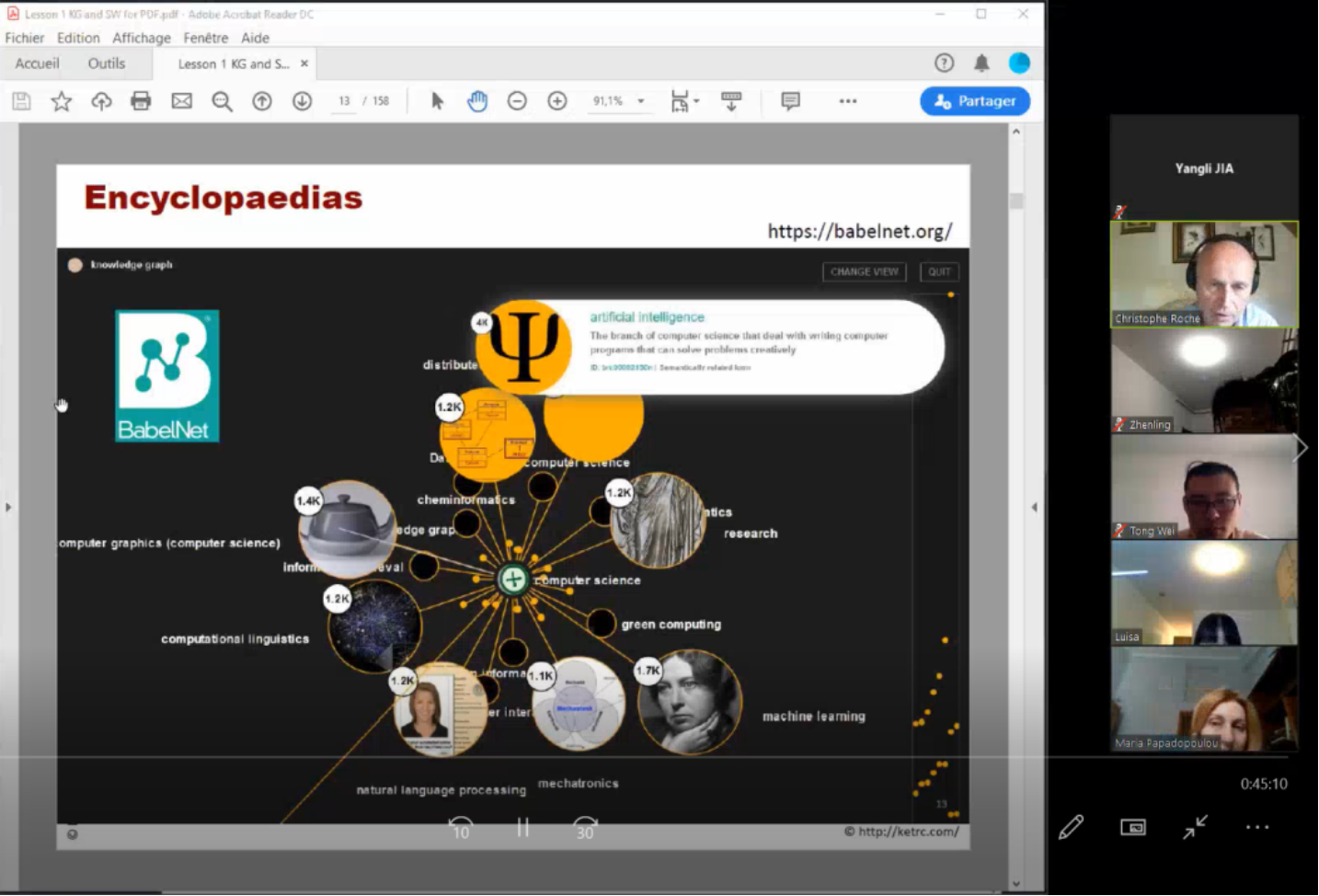 为落实公司党委关于做好疫情防控期间“停课不停教、停课不停学、停课不停研”的部署,4月23日至6月11日,beat365亚洲体育官方网站利用Zoom会议系统开展了6场线上学术报告和国际交流活动。 线上系列学术报告与交流围绕“数字人文时代的本体与术语学”展开,包括了“Knowledge Graph & the Semantic Web”、“Terminology”、“Ontology”、“Digital Humanities”、“Smart City”五个专题,由公司外知识工程与术语学中法联合研究中心主任Christophe Roche教授主讲。希腊学者Maria Papadoupulou教授、中国人民大学安小米教授、山东省标准化研究院高永超研究员、维也纳大学刘翚博士,以及多位ISO TC37委员会国际标准制定专家、 IEC智慧城市国际标准制定专家、公司知识工程与术语学中法联合研究中心成员、beat365亚洲体育官方网站部分教师与研究生等30余人参与了这一系列交流活动。 通过此次线上学术交流活动,与会专家对知识图谱、语义Web、计算术语学、数字人文和智慧城市标准等内容进行了深入交流,达成了下一步合作意向。同时,本系列活动的成功开展也拓宽了学术研究讨论的渠道,丰富了学术活动与国际交流的形式,开阔了师生学术视野。