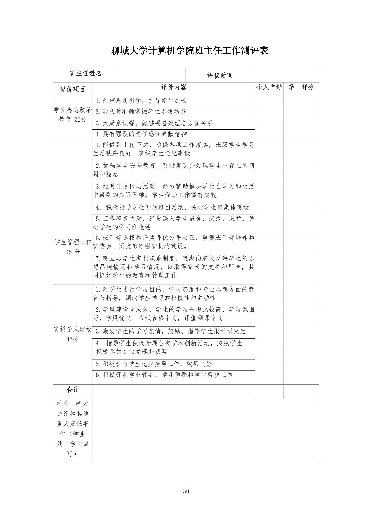 2、班主任考核应坚持基础工作与工作实绩相结合、定性考核与定量考核相结合的原则,公开、公正、公平地对班主任工作进行全面、客观、科学的评价。