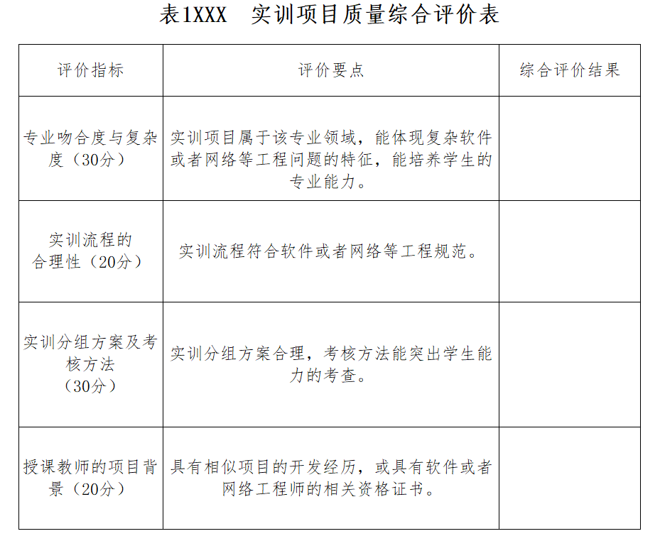组织2-3名专业教师成立评价小组,在实训项目开始之前对实训项目进行评价,根据实训大纲,给出实训项目质量的综合评价。实训项目质量的综合评价方法如下表所示。