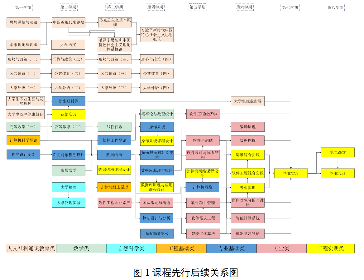 主要课程:高等数学、线性代数、概率论与数理统计、计算机科学导论、程序设计基础、大学物理、面向对象程序设计、新生研讨课、离散数学、计算机组成原理、软件工程职业素养、数据结构、操作系统、数据库原理与应用、团队激励与沟通、软件设计与体系结构、软件需求工程、计算机网络、软件测试、软件项目管理、软件工程综合实践、运维综合实践等。
