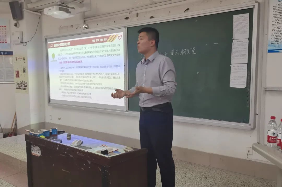 荣存福就志愿服务实施方案、志愿者日常管理办法以及经验交流等方面对西部计划进行了全面介绍和解读,他鼓励员工们以实际行动践行奉献、友爱、互助、进步的志愿精神,主动融入国家发展大局,积极投身到“西部计划”志愿服务工作中去锤炼意志品格、增长本领才干。他强调,西部计划带给大家的不仅仅是一份履历上的证明,更多地是深入西部基层生活后的成长和经历,希望大家珍惜此次机会,去感受祖国西部大地的心跳,去聆听西部人民的心跳。史秋波结合自身就业经历,以亲身感受告诫应届毕业生在选择就业岗位时切忌好高骛远,并围绕如何正确认识自己、正确认识社会、适时抓住机遇等方面引导员工做好就业前心理建设,助力应届毕业生尽快尽早就业。张雪就此次宣讲会做出总结,号召应届毕业生投身到“西部计划”志愿服务工作中,激励同学们将“爱国之志”化为“报国之行”,踔厉奋发、砥砺前行,让青春的列车向西驶去,到祖国和人民最需要的地方,争做新时代的奋进者,不断为援西计划注入新鲜力量!