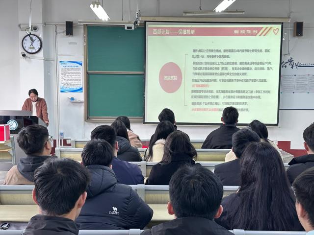 宣讲会伊始,邹晓凤通过PPT向各位毕业党员介绍西部计划“公开招募、自愿报名、组织选拔、集中派遣”的招募方式。她讲明西部计划的基本情况,从地理位置偏远但充满发展潜力的地区介绍,到涵盖教育、医疗、农业等多领域的具体岗位分配,让同学们对服务地点与内容有了直观认知。在政策解读环节,不仅提到了生活补贴等物质保障,让同学们在服务期间无后顾之忧,还着重介绍了考研加分等激励政策,为有深造计划的同学提供了有力支持。她还深入阐述了志愿者的四大原则、三大特征以及“勤奋、友爱”的志愿者精神,鼓励同学们将个人理想融入国家发展大局,用所学知识为西部发展添砖加瓦,在西部的磨砺中成长为有担当的新时代青年。