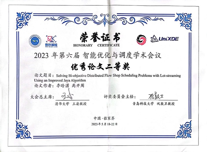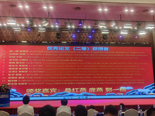 近日,公司高开周老师课题组最新研究成果《An Improved Artificial Bee Colony Algorithm with Q-learning for Solving Permutation Flow-shop Scheduling Problems》获得第六届智能优化与调度学术会议优秀论文二等奖。该论文第一作者为公司2020级硕士研究生李晗潇,指导老师为高开周博士。公司桑红燕教授作为颁奖嘉宾之一,为获奖者颁奖。