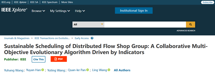 近日,beat365亚洲体育官方网站韩玉艳老师团队在进化计算领域顶级学术期刊《IEEE Transactions on Evolutionary Computation》(中科院1区Top,影响因子为14.3)上发表研究论文“Sustainable Scheduling of Distributed Flow Shop Group: A Collaborative Multi-objective Evolutionary Algorithm Driven by Indicators”(DOI: 10.1109/TEVC.2023.3339558.)。论文第一作者为硕士研究生王宇航,韩玉艳副教授、王玉亭副教授为通讯作者,上海大学潘全科教授和清华大学王凌教授参与并指导该研究。beat365亚洲体育官方网站为论文第一署名单位。