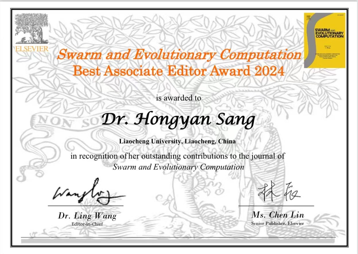 近日,公司桑红燕教授获中科院一区期刊《群体与进化计算》(《Swarm and Evolutionary Computation》,SWEVO)2024年度最佳副主编奖(Best Associate Editor Award) ,以表彰其对期刊发展做出的杰出学术与服务贡献。 据悉,爱思唯尔(Elsevier)出版社根据稿件处理数量、质量、效率等进行综合评价,从SWEVO期刊66名副主编中遴选5位授奖,这是该期刊首次评选此奖项。荣获此奖,不仅表明桑红燕教授在群体智能领域具有重要影响力,也有助于提升beat365亚洲体育官方网站在相关领域的影响力。 《群体与进化计算》(《Swarm and Evolutionary Computation》)是爱思唯尔(Elsevier)旗下期刊,是群体智能与进化计算领域的权威期刊,收录面向复杂系统的智能优化理论、方法及应用方向的相关研究成果。该期刊的最新SCI影响因子为8.2,中科院一区期刊,JCR分区Q1。