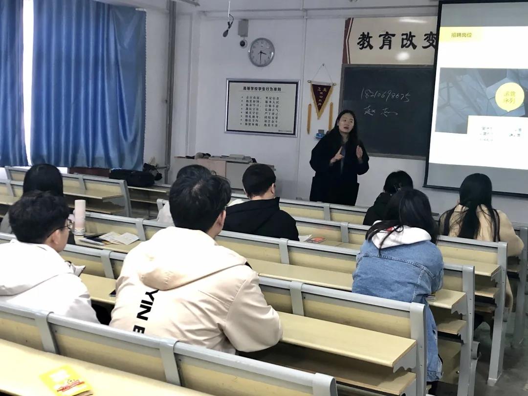 本次招聘会的主讲人为课观教育集团校园招聘部经理赵志、金融运营四部经理暨东北地区负责人刘娟。赵志为大家介绍了课观教育集团的关于我们,他讲到:“课观教育集团拥有教研力量和技术团队,倡导“高效学习,快速成长”的学习理念,致力于以科技提升用户体验和学习效率,用互联网+来打破优秀教师地域分布不平衡的现状。”同时,他也就大家最为关注的薪酬待遇、补贴福利等问题做出详细解答。同学们与老师积极互动,活动氛围融洽。随后,刘娟结合自身就业经验,向同学们提出宝贵建议。她表示,要按照职业的标准化、规范化、制度化要求自己,在细节之处做得专业,用理性的态度对待工作,保持自己的敬业态度。在“有问必答”环节,同学们积极提出问题,两位老师也耐心进行了现场答疑,并告知同学们详细的招聘地点、招聘需求等信息,热情地欢迎同学们参加下一步的面试。